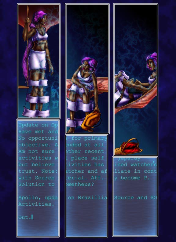 Our brand spanking new updates start here. For the record, the thing that Miranda is taking out of the bag is a very high tech laptop, and the text at the bottom is something she's typing. As for why it's all broken up and everything...well, if it wasn't, it'd be easy to read, now wouldn't it?