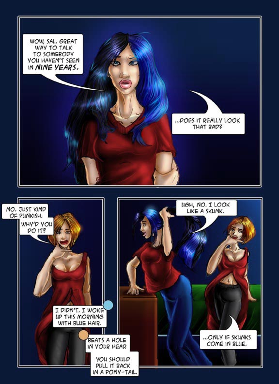 I can seriously say I have waited TWO. FREAKING. YEARS. to write this scene. Some of the other stuff in this chapter is only a year old, some a few months old, some as new as last week. But this sequence of events, from the shot to the blue stuff to this page today were all planned from day one. Why did I wait so long if the hair thing is what I named the comic after? Well...first because it took this long to get here. Second because...you know how in movies the title of the movie is drawn from something vaguely meaningful and/or when the real story starts? The real story's starting.