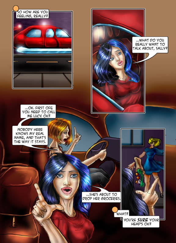 Oh, and someone mentioned that it didn't seem like Lucy and Sarah knew each other (in light of the last comic, where Sarah says she knew Lucy nine years ago). Lemme address that and get something else off my chest. The "Sally" is not a typo. Sarah knew Lucy nine years ago as a young girl named Sally (This was a part of the plot two years ago, this was a part of the plot one year ago, last month, this month, yesterday, today. Just for the record) It might help if you re-read these pages.