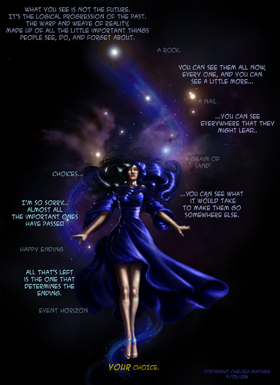 Why did I do the pretty picture? Because I wanted to do a pretty picture. It'd been a while since the last time I'd done one, and I wanted to see how well (or not well) a few techniques lent themselves to actual digital paintings. What was REALLY fun was doing the space/scene behind her and figuring out new and different ways to get it to look realistic. That. Was. Fun.