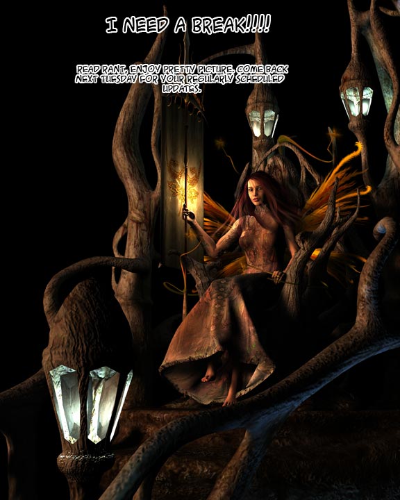 Right now I'm working on four different things: A 3d dress model, a digital painting, the comic, and about fifteen murels AND building facades for my church. So far, I've made comicking and the murels a priority, but I'd also been taking about three days off from the murels a week. Last week I did not. This week I got a little overenthusiastic with the dress model on Sunday and forgot that half of Monday was going to be spent painting cartoon crabs, sandcastles and sunglassed starfish. As was Tuesday, in which I painted the living crap out of a sandcastle and came away so tired I fell asleep on the couch before I made it to bed. And I still slept till noon. I have fifteen walls, four to five facades and three other artists helping me, including my mother. Our deadline is April 1st. So far we have finished four murels and have started two more. Heracles had it easier. He didn't have a deadline. In short, I am about to drop dead of creative exaustion.I want a break, I need a break. I am using Unpaid Creator's Perogative (it exists. Trust me. That exists) and taking a one-update break.